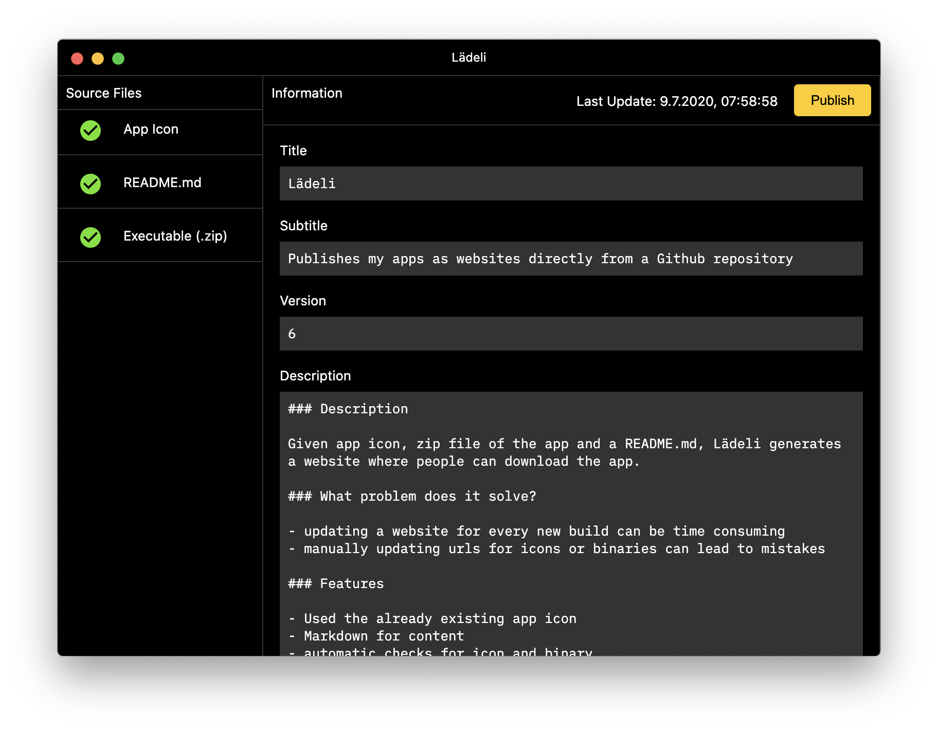 Given app icon, zip file of the app and a README.md, Lädeli generates a website where people can download the app.